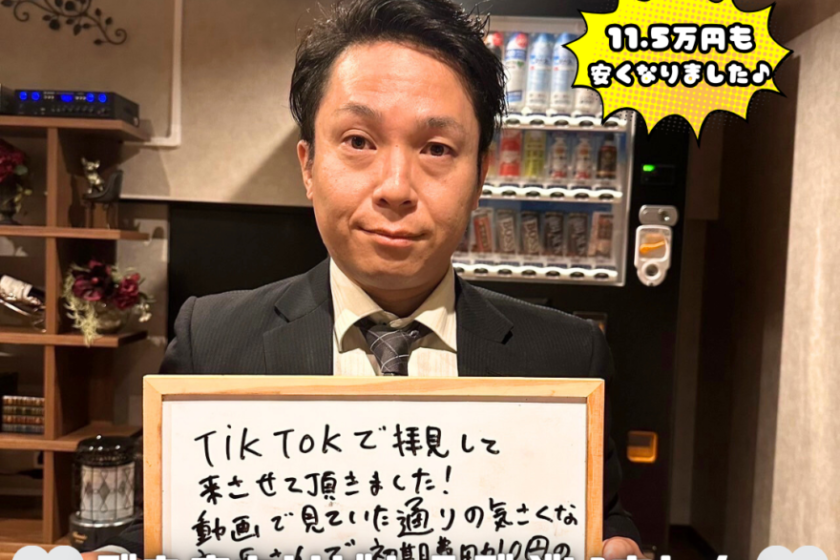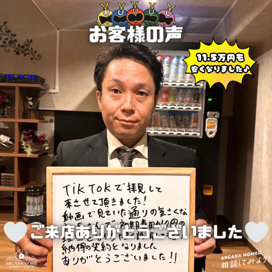 TikTokで拝見して来させて頂きました! 動画でもいていた通りの気さくな社長さんで初期費用が0円の理由を分かりやすくせつめいしてもらい納得の契約となりました ありがとうございました!!