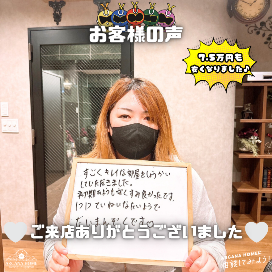 すごくキレイんあ部屋をしょうかいしていただきました。 初期費用も安くすみよかったです。 1つ1つていねいなないようでだいまんぞくです♥